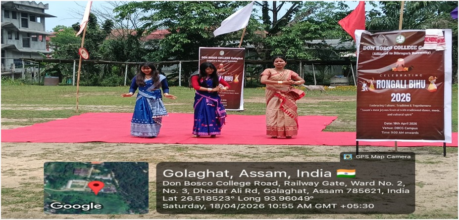 18th April, 2026-On 18 April 2026, the celebration of Rongali Bihu started in the morning at 10 a.m. at Don Bosco College, Golaghat. The programme was conducted in collaboration with the Cultural club of the college. The main objective of the Bihu celebration was to celebrate the cultural heritage of Assam and to educate the students about the Assamese tradition. MitaliMushary, a student from English department hosted the programme. With the warm weather, the celebration started with a short Assamese poem followed by a heartfelt welcome speech by Fr. Principal. Dr. A. Amaladoss, which was followed by a respectful tribute to the music legend Zubeen Garg, acknowledging his monumental contribution to modern Assamese music and culture.